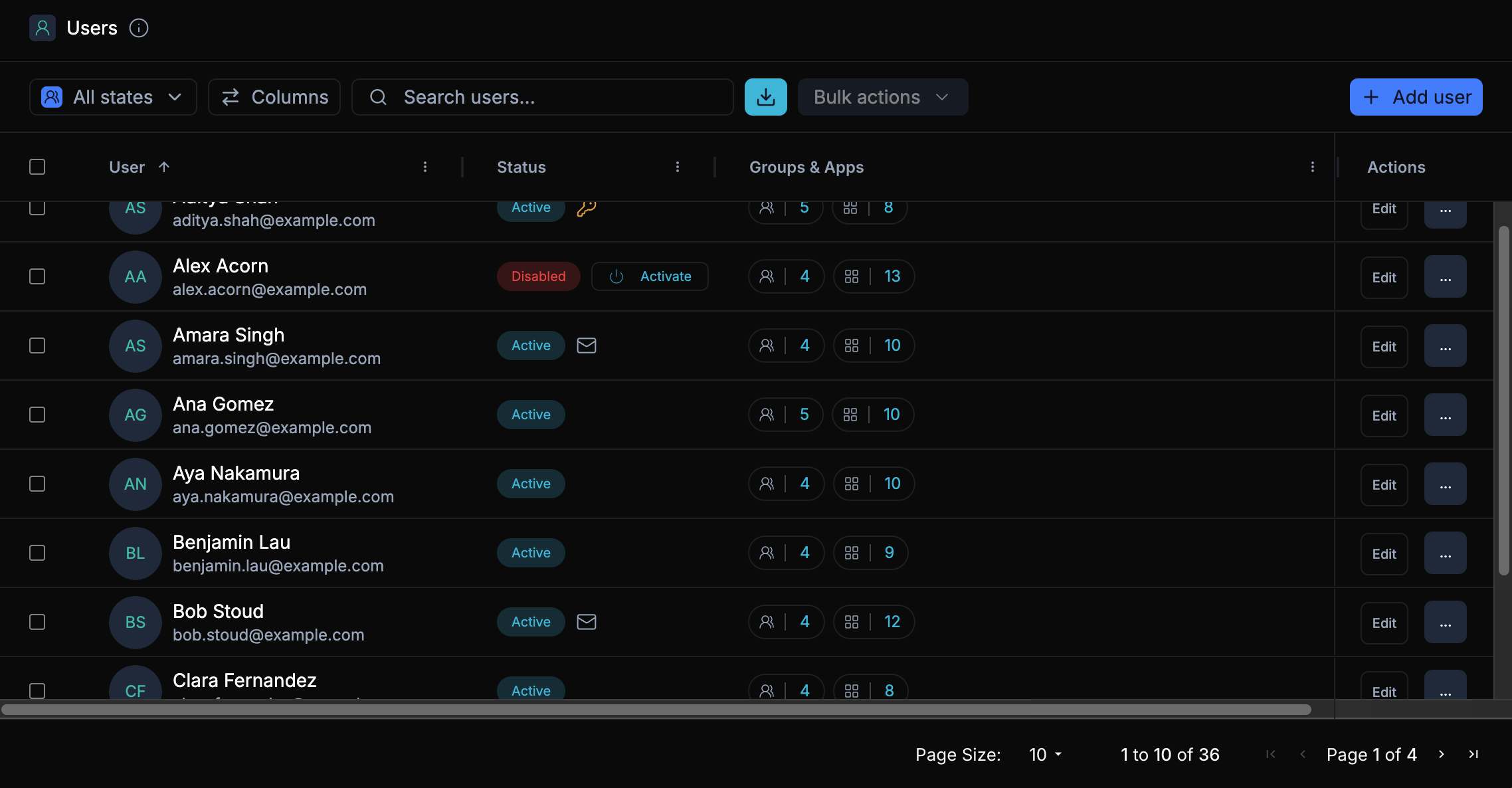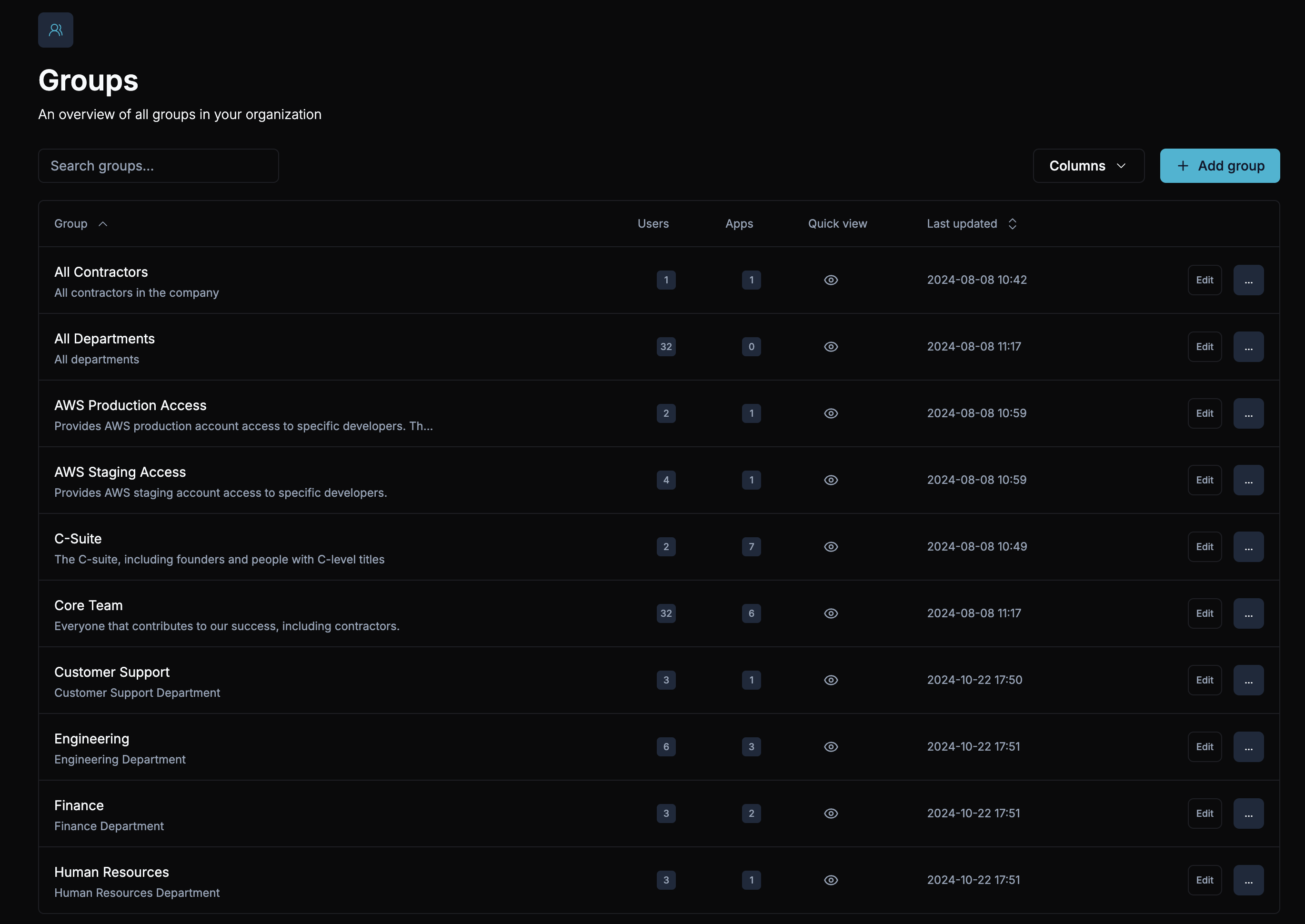 User management just got a boost! You can now quickly see how many groups and apps each user is assigned to. Plus, weâve added optional columns for departments and locations, giving you a more comprehensive view of your users. The Name and Email fields are now condensed for faster access to key info.