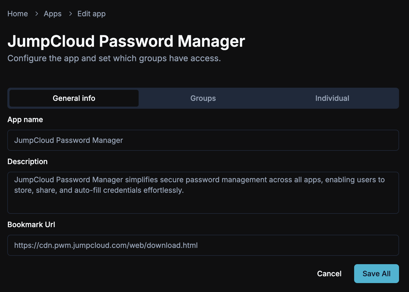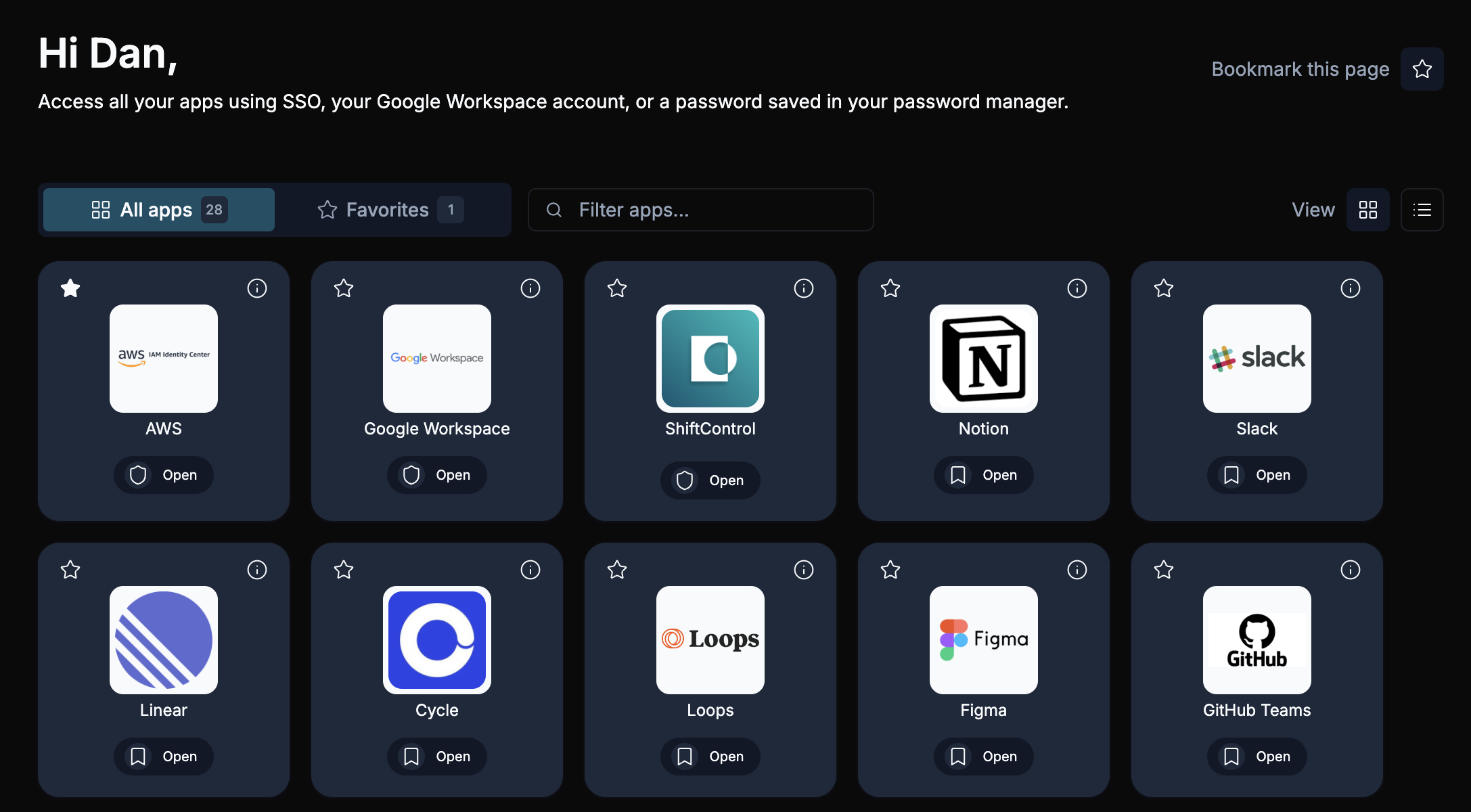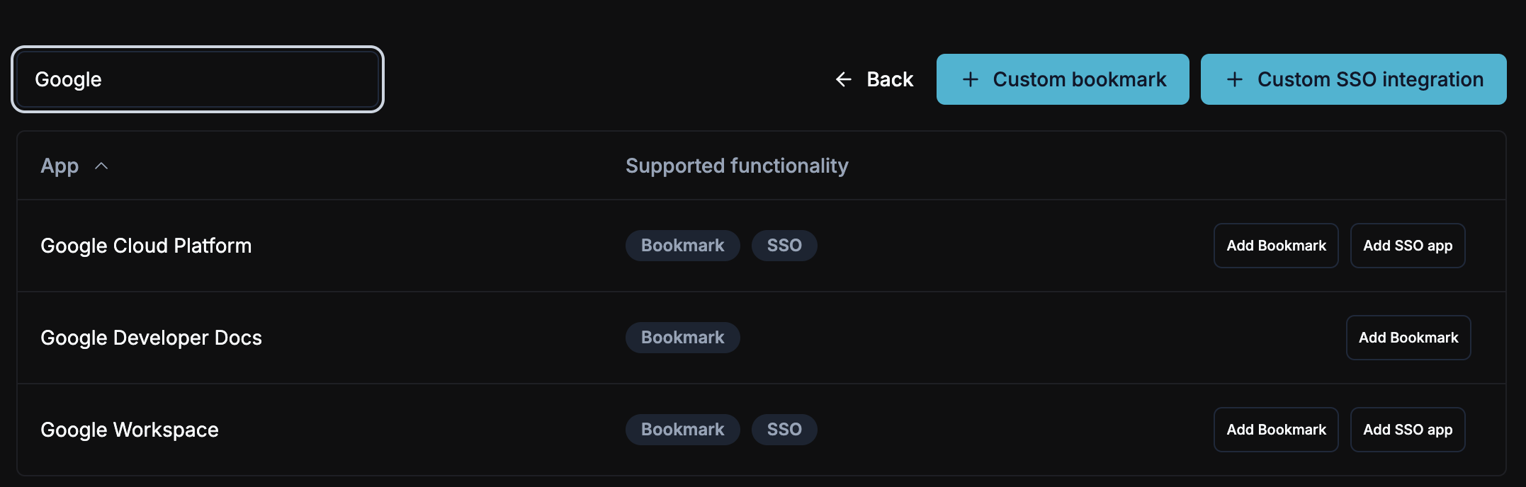 Weâve grown our app catalog to include over 950 apps, allowing you to quickly configure and manage Single Sign-on (SSO) . However, we recognize that many users might not have licenses on the tier that supports SSO. To address this, weâve enhanced the experience by fully managing our own app catalog. You can now easily add apps as bookmarks, with pre-filled login URLs and descriptions for appsâno more manually entering URLs or descriptions! Each bookmark will take you directly to the appâs login page, helping you stay productive and avoid unnecessary marketing pages.