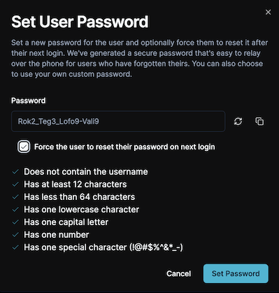 â ď¸ We always recommend forcing the user to reset the password on the next login to avoid the chance of them using a temporary password permanently.