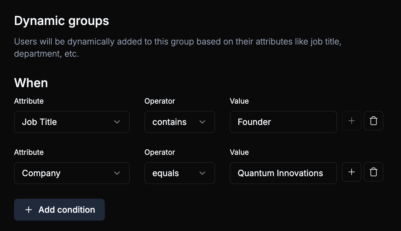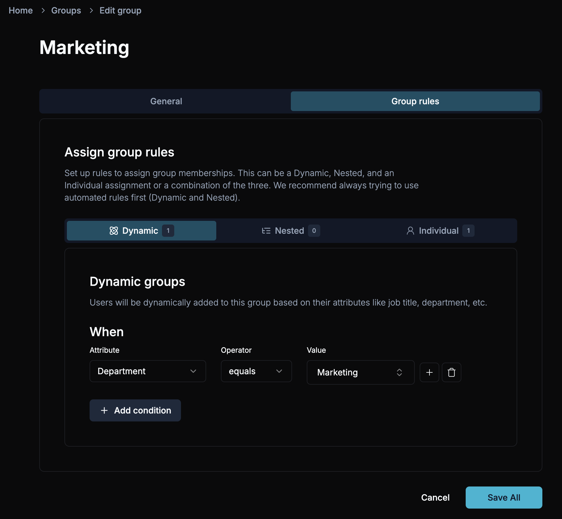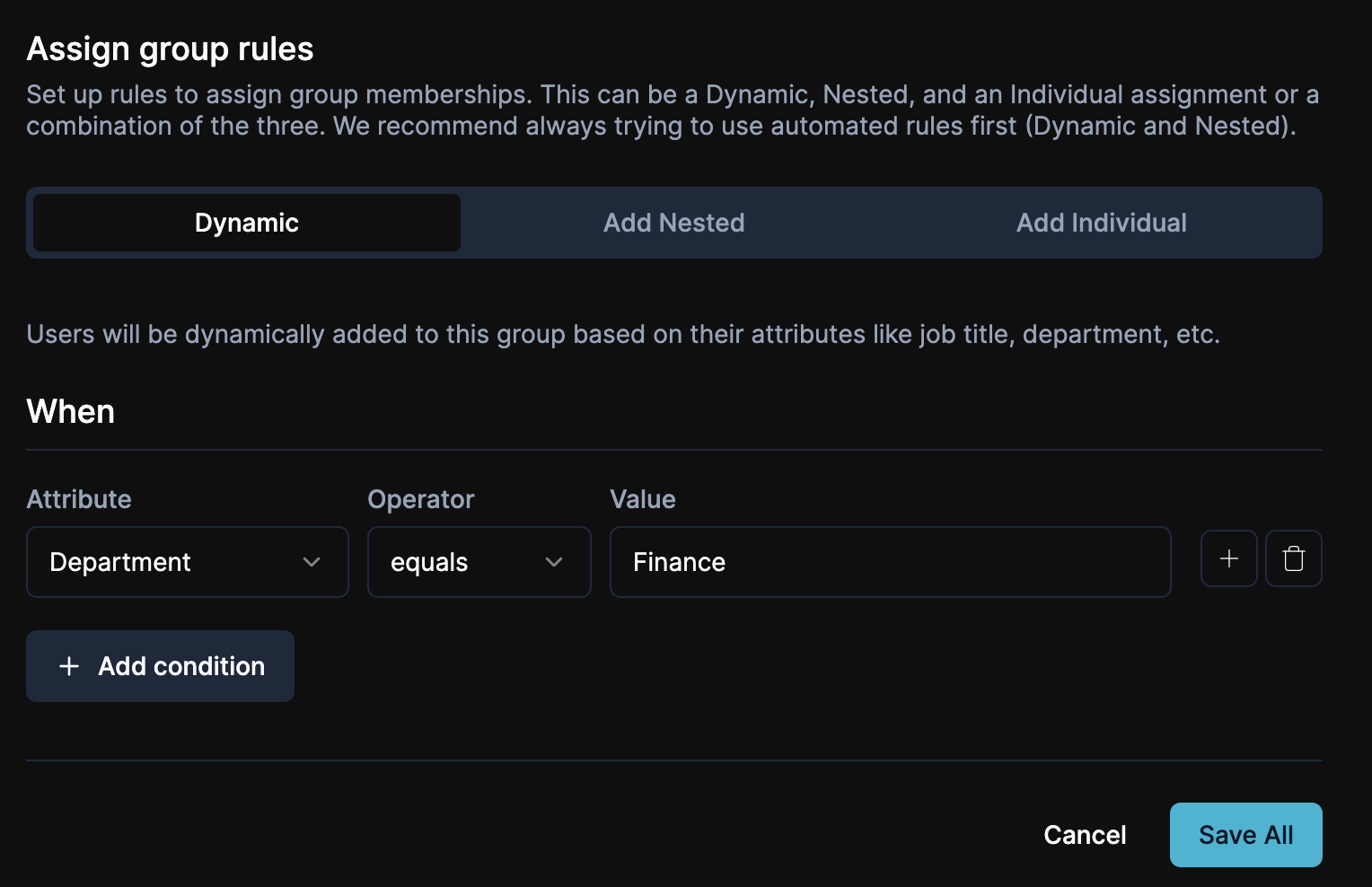 Weâve improved the interface to make configuring and customizing group memberships more intuitive. Now, itâs easier to see how different rule types interact. You can combine dynamic rules, nest existing groups, and add individual members to create powerful, customized group memberships. This change also includes updating the âSaveâ button to âSave All,â ensuring itâs clear that all settings across tabs are saved together.