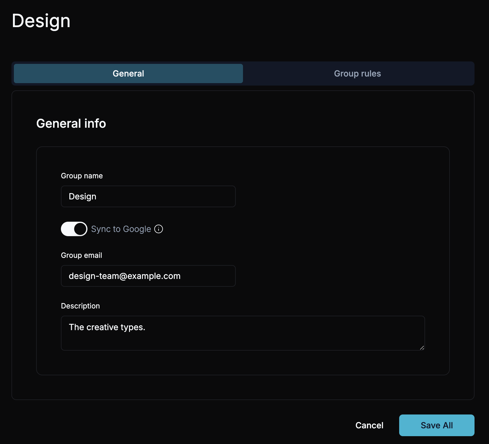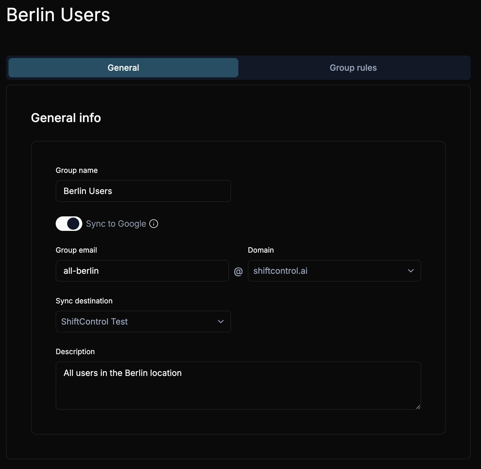 Now, with a simple setup in ShiftControl, you can sync groups and memberships directly to Google Workspace. Just update a group, designate its email address, and let the automatic sync take care of the rest. Weâll pull in the Group Name, Description, and members from Google, ensuring that your group information stays current and aligned across platforms without manual updates.