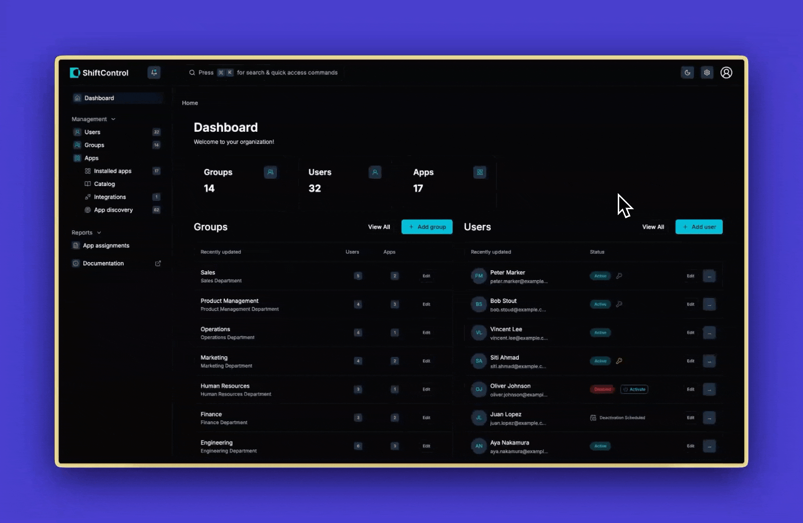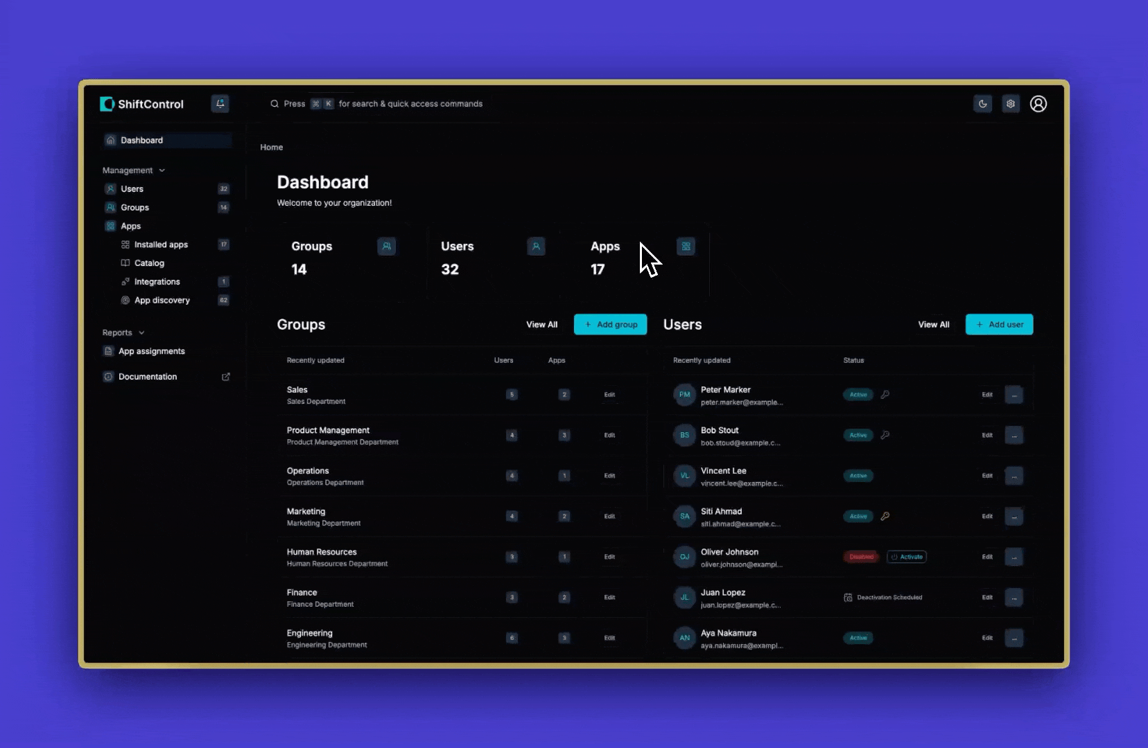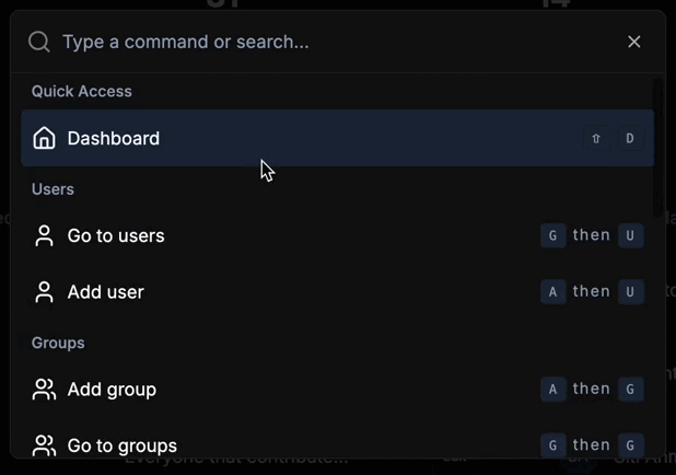 Effortlessly navigate ShiftControl with our new Command Bar! You can now quickly access the dashboard, users, groups, and appsâall in one convenient place. Use intuitive hotkeys to speed up your workflow and streamline your experience. Searching and managing your ShiftControl environment has never been easier!