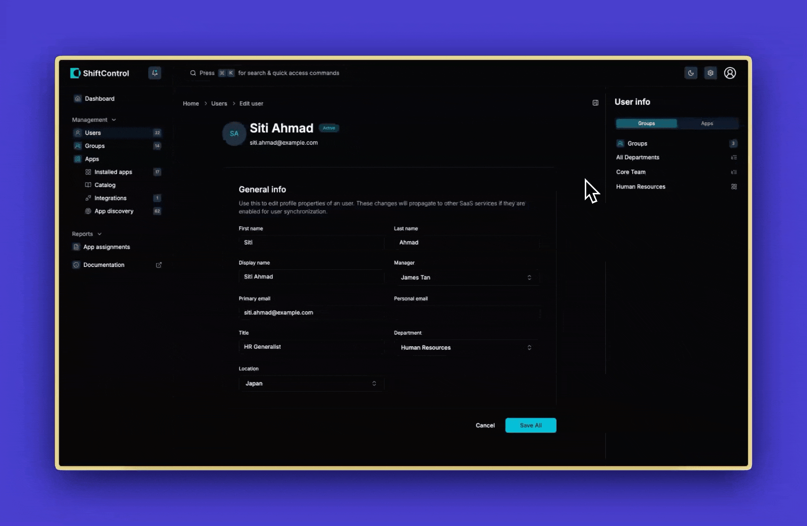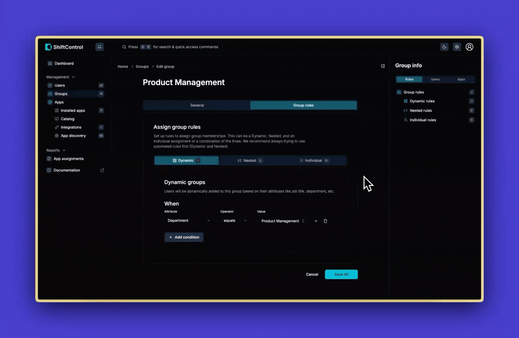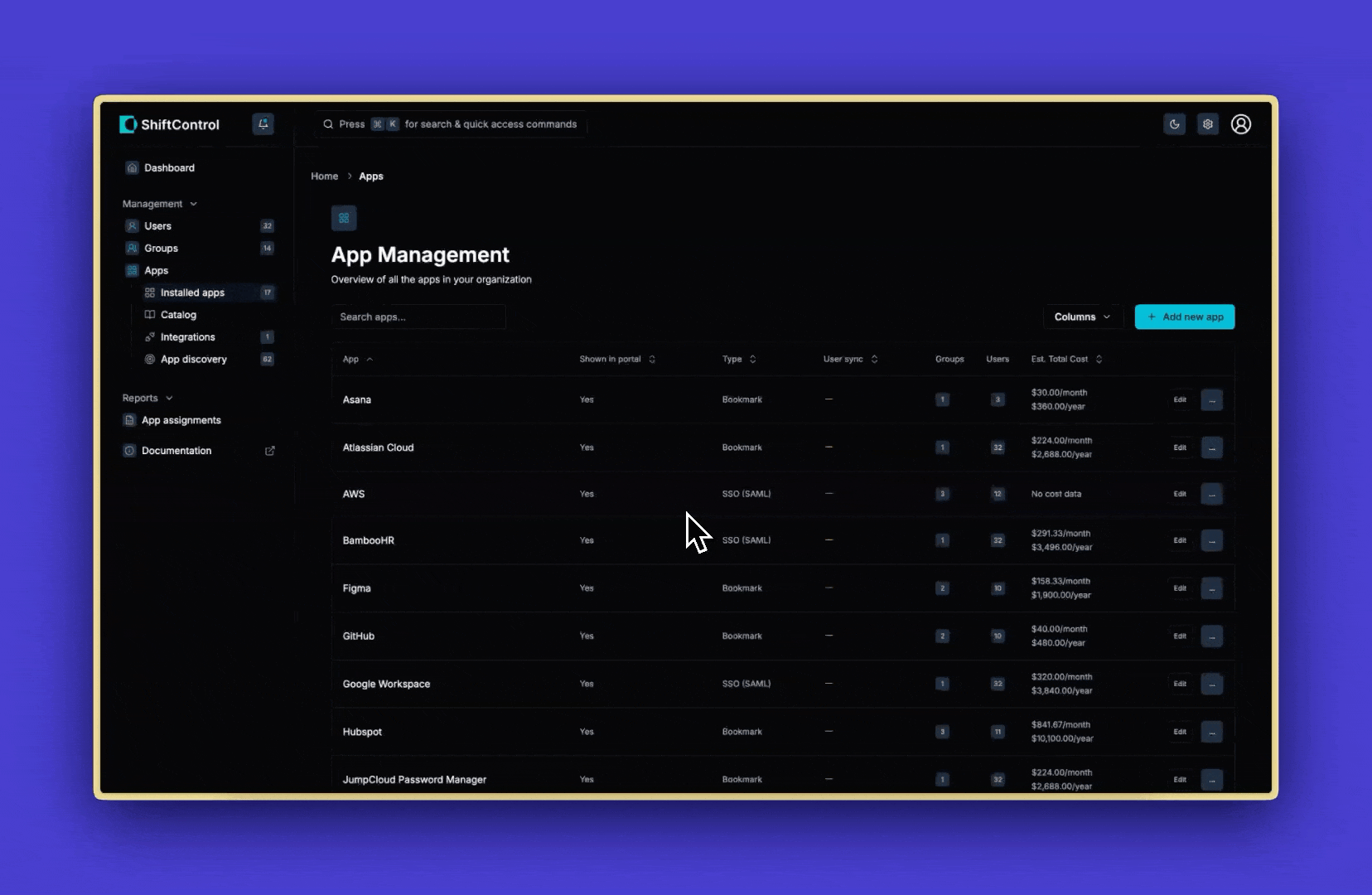Effortlessly navigate ShiftControl with our new Command Bar! You can now quickly access the dashboard, users, groups, and appsâall in one convenient place. Use intuitive hotkeys to speed up your workflow and streamline your experience. Searching and managing your ShiftControl environment has never been easier!
