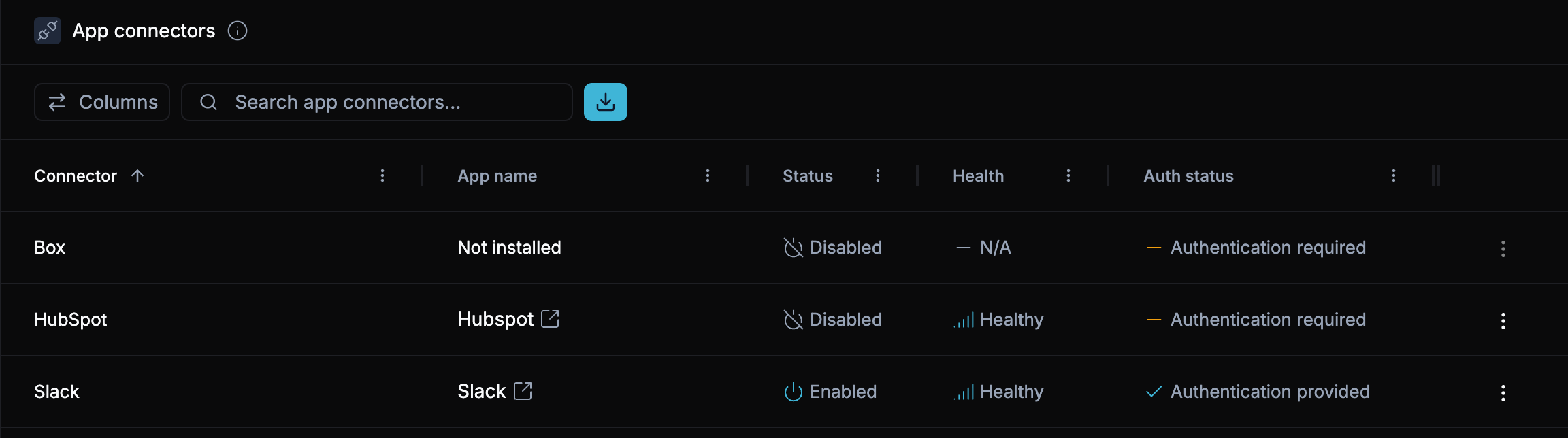 Apps include everything else â the SaaS tools you integrate with to sync user information in and out of ShiftControl. Use this section to manage authentication and connection status for your app connectors.