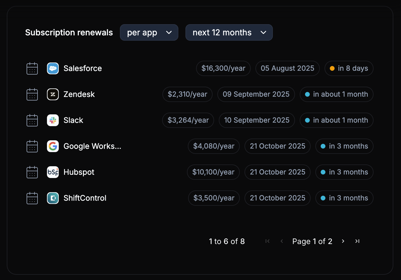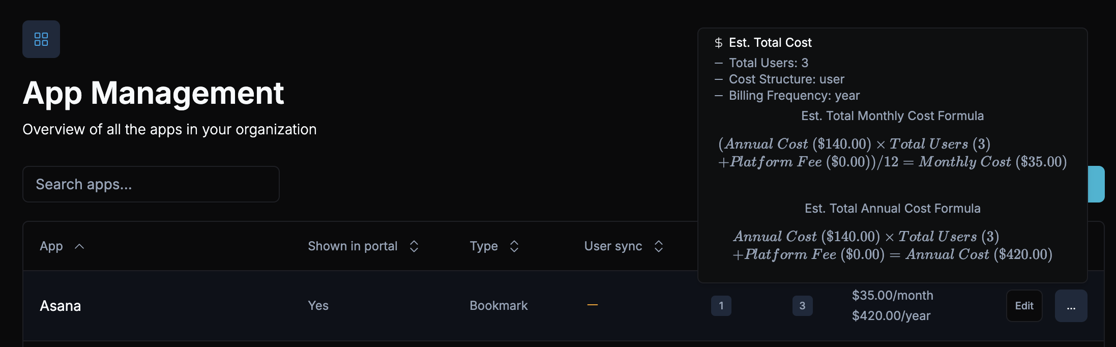 Weâve added a new feature that shows a quick breakdown of your SaaS costs per app, giving you the monthly and yearly cost calculations based on the number of users and contract terms. Itâs now easier than ever to understand how much youâre spending on each tool and make smarter decisions for your budget. This detailed view is a game-changer for keeping your SaaS spending under control.