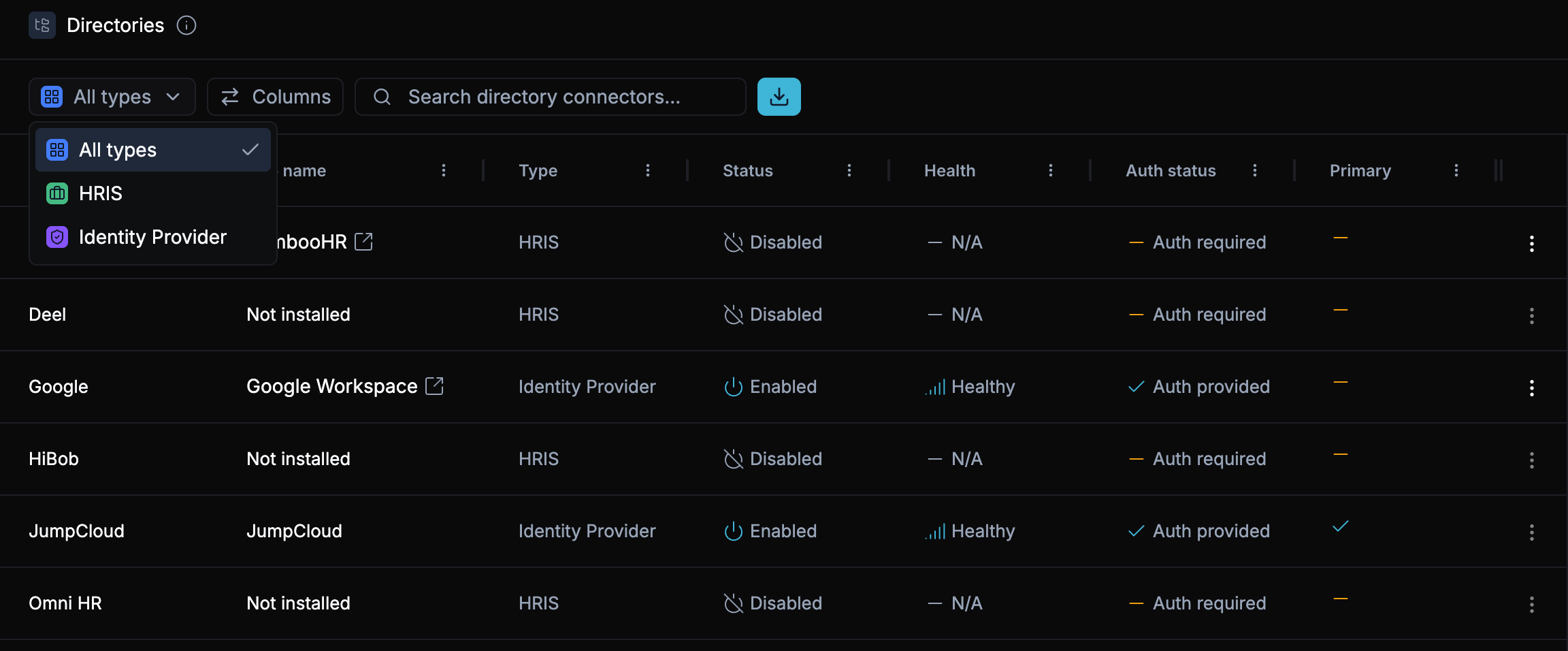 Directories include your Identity Providers and HRIS systems â the sources of truth for your user and employee data.