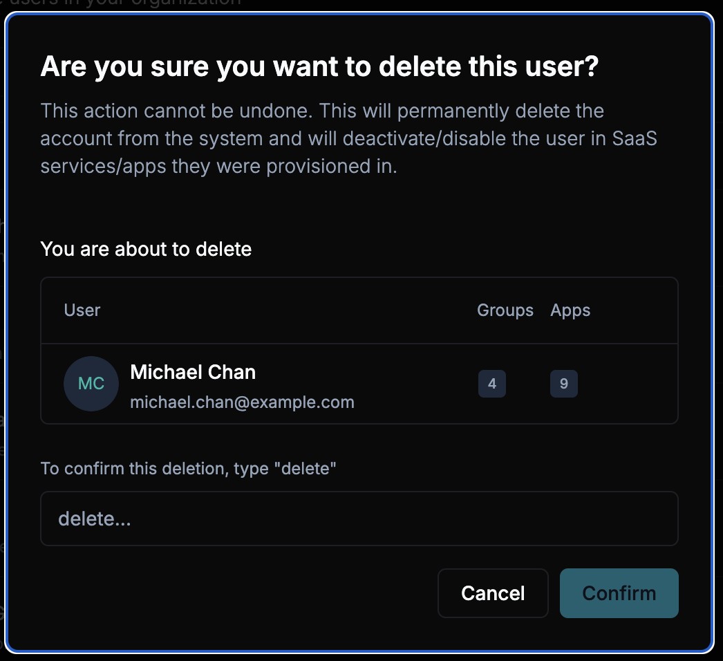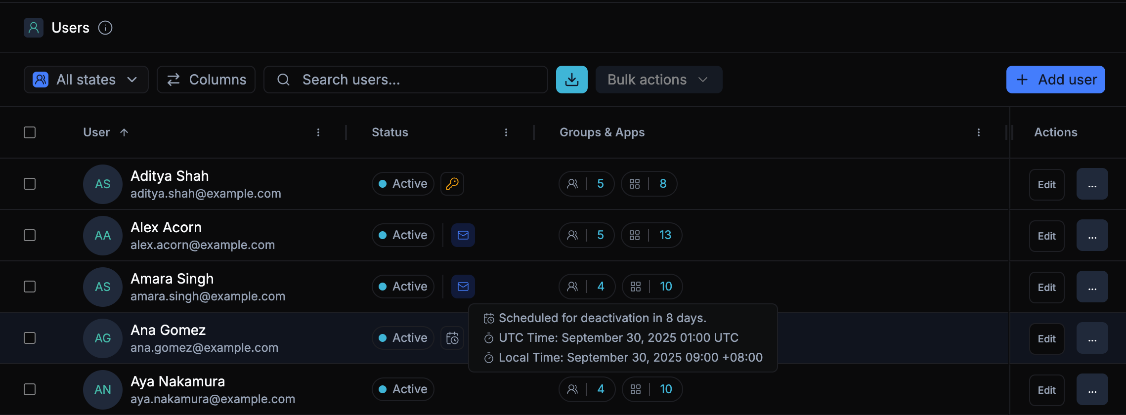 Planning ahead? Now, you can easily schedule user offboarding for one or multiple users at once! Simply set the date, and weâll automatically disable the users, revoke their access, and remove them from any synced applications. Offboarding has never been simpler or more streamlined.