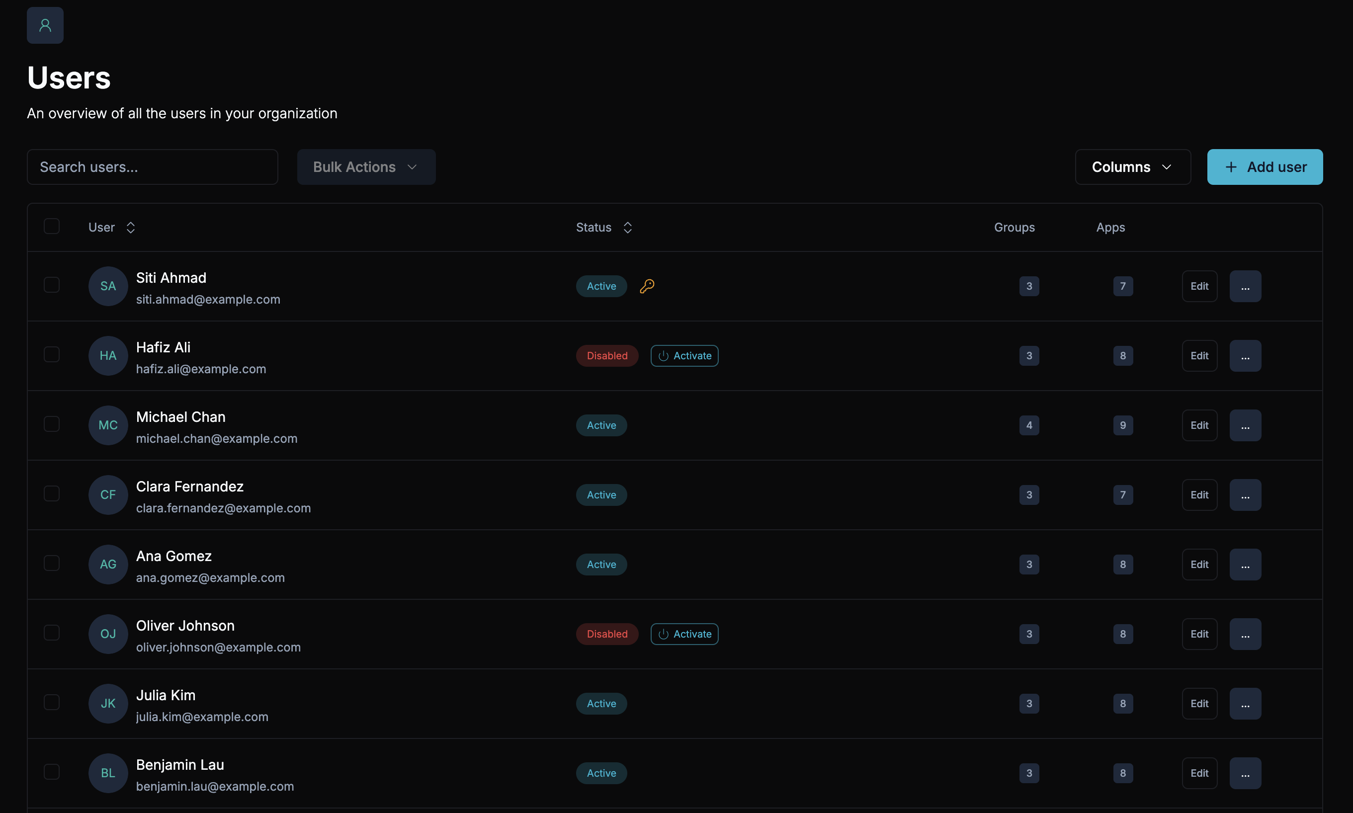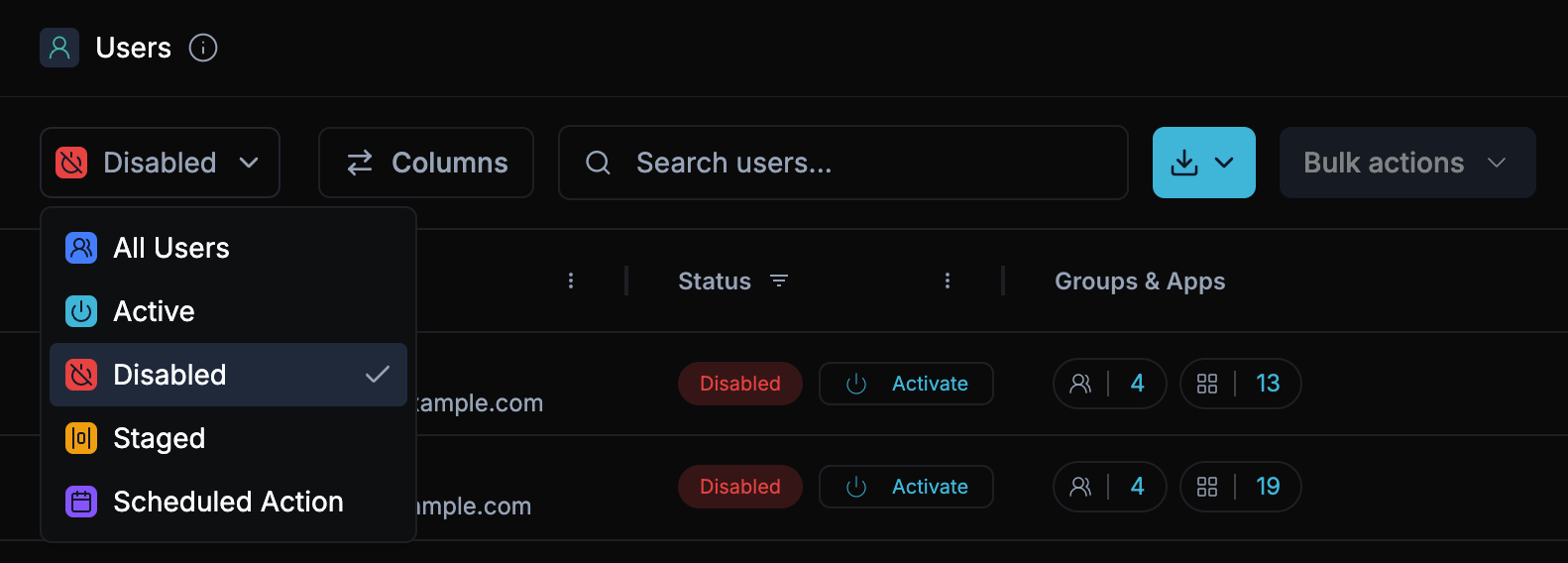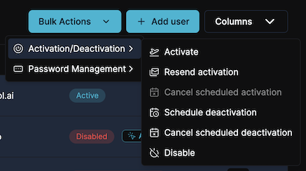 Need to bring a batch of previously disabled accounts back online after a temporary freeze or cleanup? You can now re-enable multiple users in one swift move! Simply select the disabled accounts and hit Enable in the Bulk Actions menu. Itâs a speedy quality-of-life upgrade that gets everyone back to work without the click marathon.