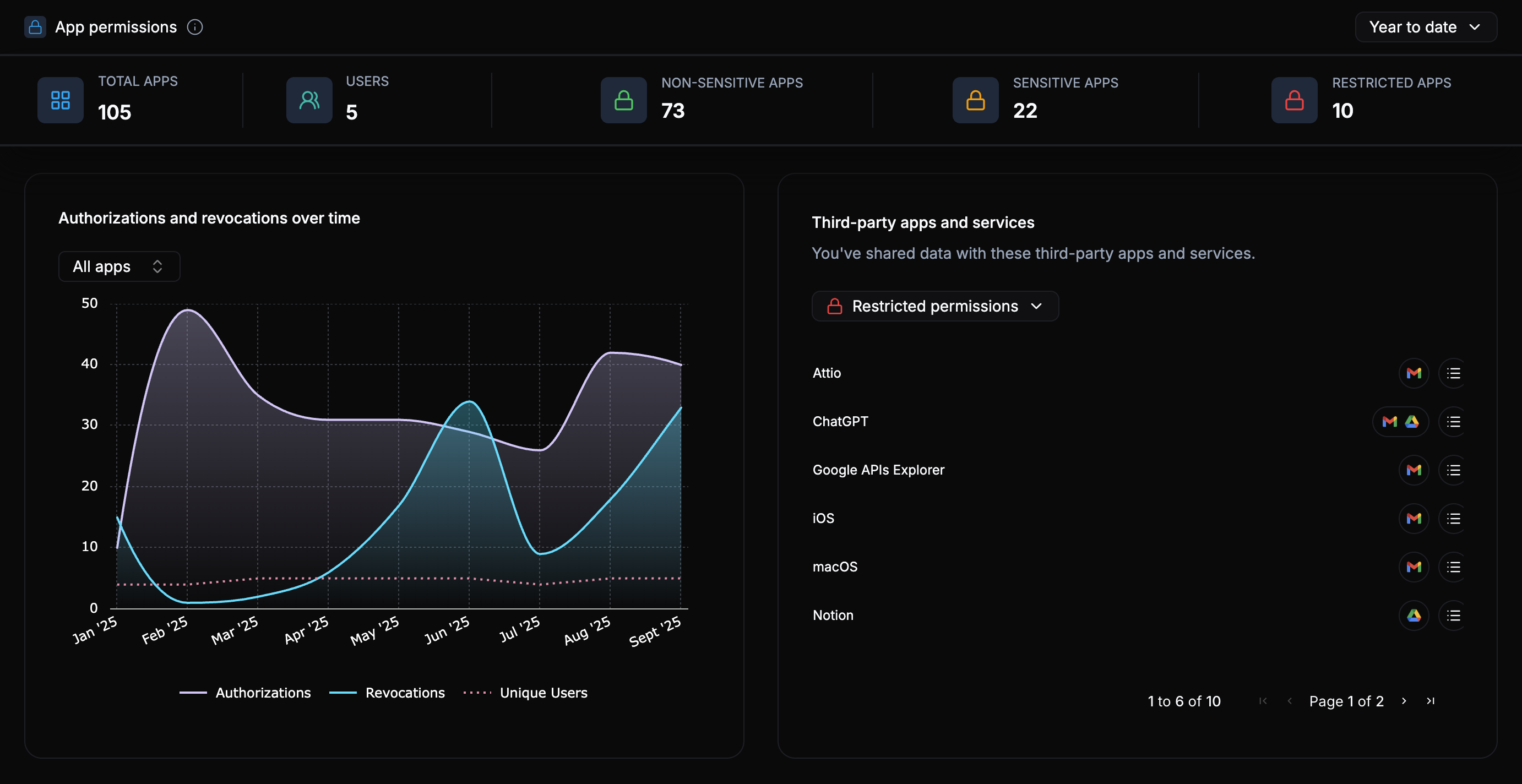 Many business apps connect through Google using secure authorization flows (known as OAuth). These connections can expand over time, and without proper oversight, they create risk. The new Permissions Dashboard helps teams keep that risk in check by surfacing all connections, scopes, and user actions in one easy-to-use view.