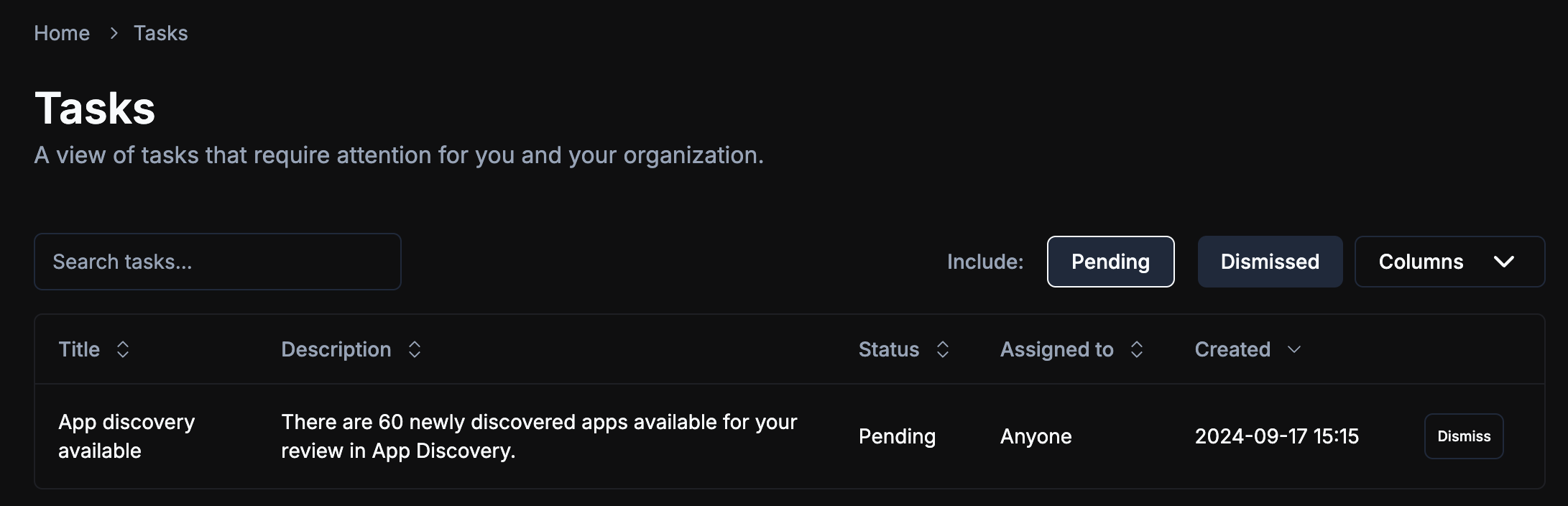 With this first release, Task Management highlights the actions that need your attention, such as deciding what to do with newly discovered applications. The task view helps you easily identify tasks with clear statuses, descriptions, and assignment options, giving you full control over who handles each task. In this early version, youâll be able to manage tasks like reviewing apps discovered through Google Workspace integration.