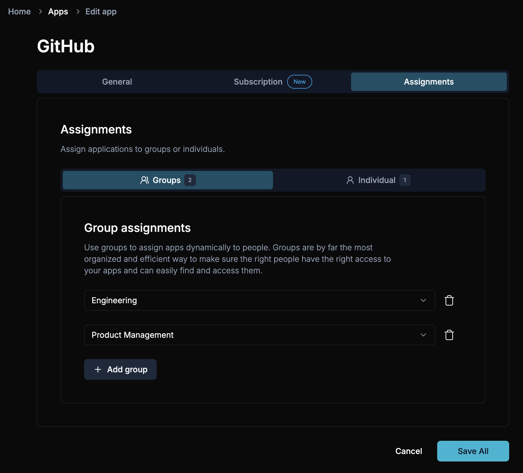 In both the group and app editing screens, you can now instantly see how many configurations are active in each tab. For example, in a group, youâll know youâre using 3 Dynamic Rules and 1 Individual Assignment without digging into each section.
