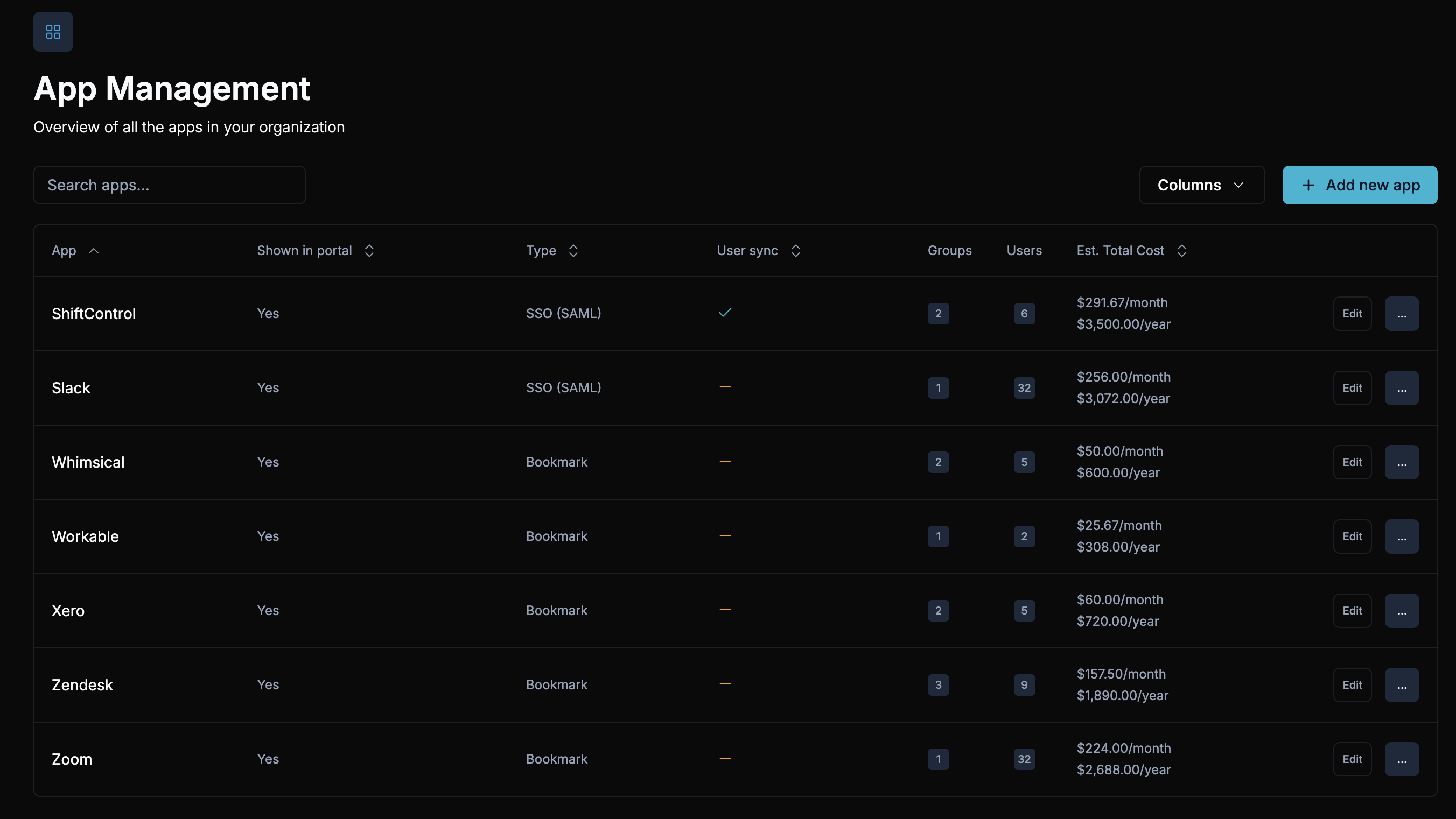 App management just got more informative! Weâve updated the user sync status icons and added key details, like how many groups are assigning the app and how many users are assigned. Hovering over the group number will reveal which groups are in use. Additionally, weâve introduced new fields for Estimated Total Cost and Currency (Available as an optional column) as part of our new SaaS Cost Management features.