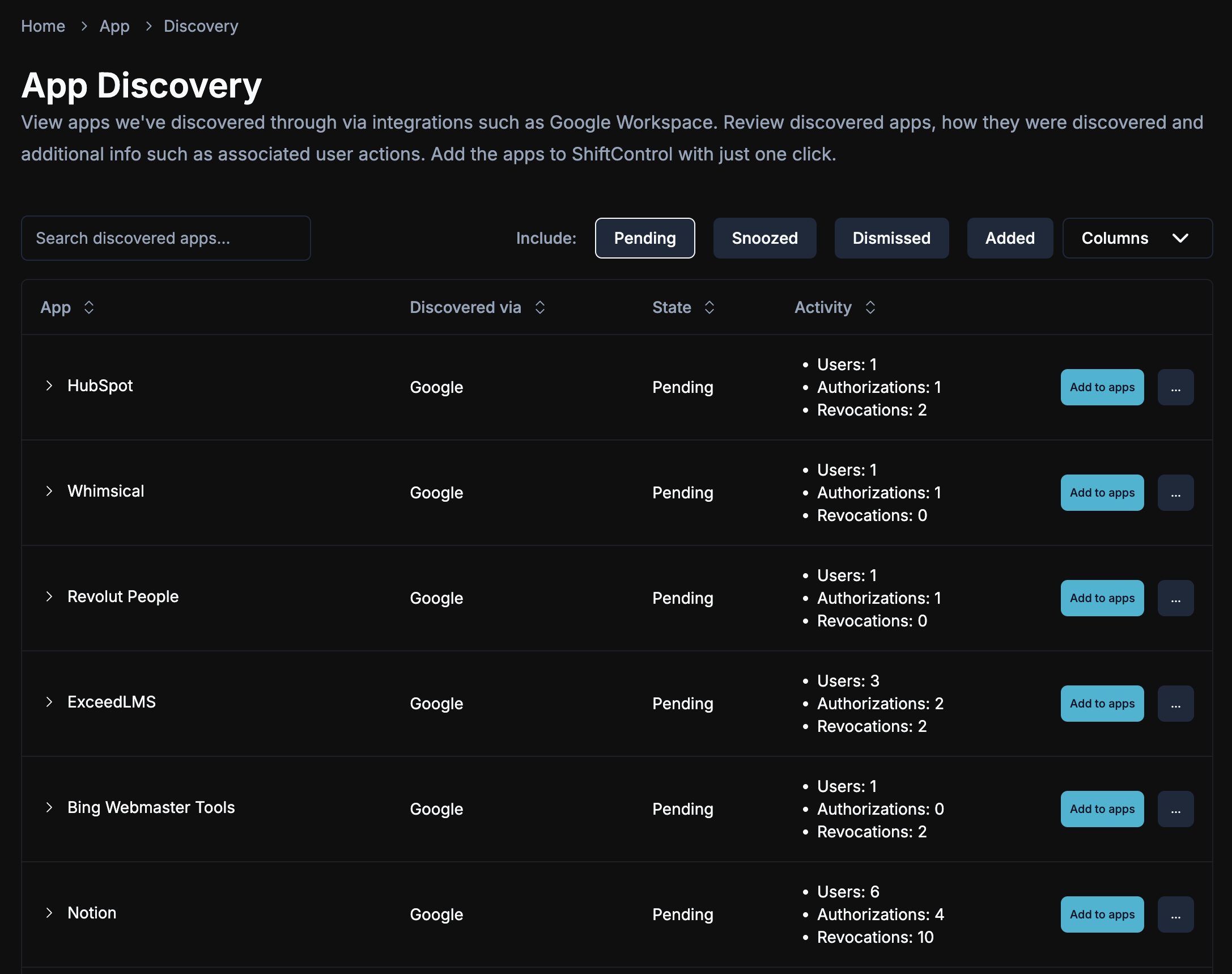This enhancement to our App Discovery feature empowers you to better manage SaaS services by helping you identify and add new applications to ShiftControl while also detecting unexpected uses of Google accounts and potential shadow IT. Itâs an essential tool for maintaining control and ensuring secure use of your organizationâs digital footprint.