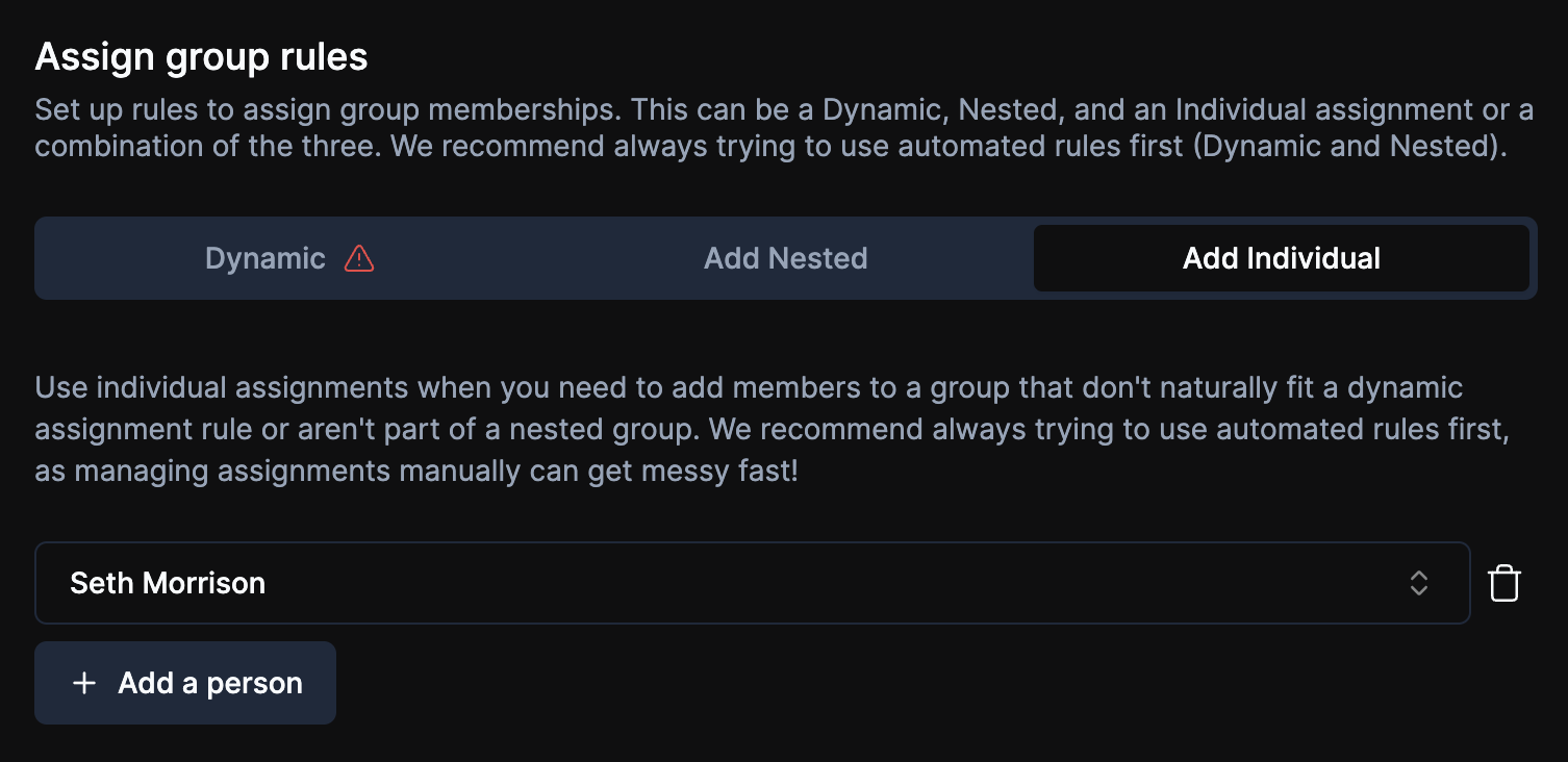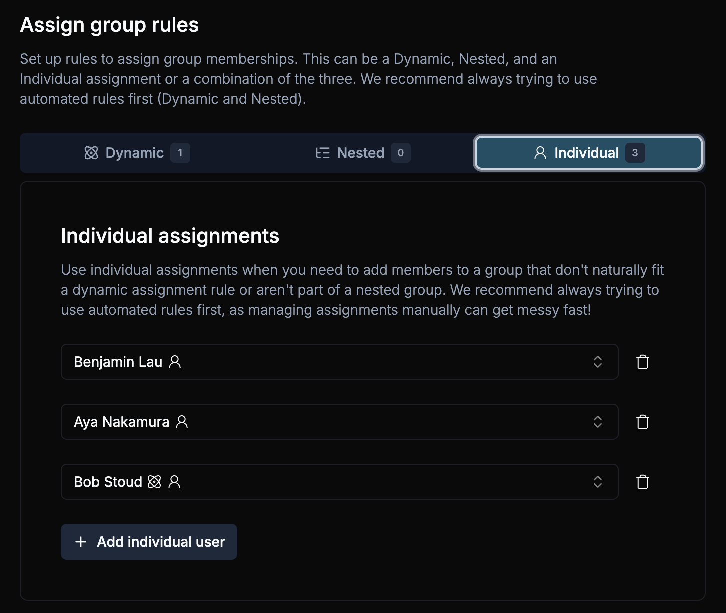 You told us it was hard to tell when someone was already added through another method, especially when cleaning up manual assignments or switching to automated rules. Now youâll see exactly how each user is assigned, wherever you manage groups: