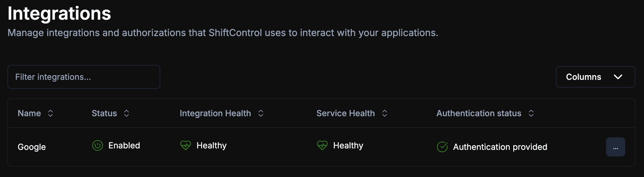 Weâve introduced a dedicated area for discovering and managing integrations, providing you with full control over how ShiftControl interacts with your applications. Each integration requires secure credentialsâwhether API keys or OAuth tokensâwhich we support and store securely. This feature allows you to monitor critical data points like integration health, service health, and authentication status, giving you real-time insights into the connections your business depends on.