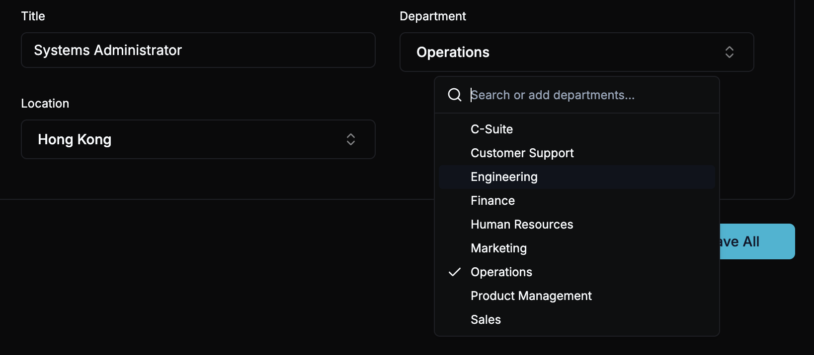 You can now manage departments more easily with our updated dropdown field. Previously a free text field, the department selection is now a pull-down menu available in the user edit areas and dynamic group rules. This change helps eliminate mistakes like typos or inconsistent capitalization, ensuring that dynamic rules work as expected when defining groups by department. You can also quickly add new departments directly from the dropdown, streamlining the process even further.
