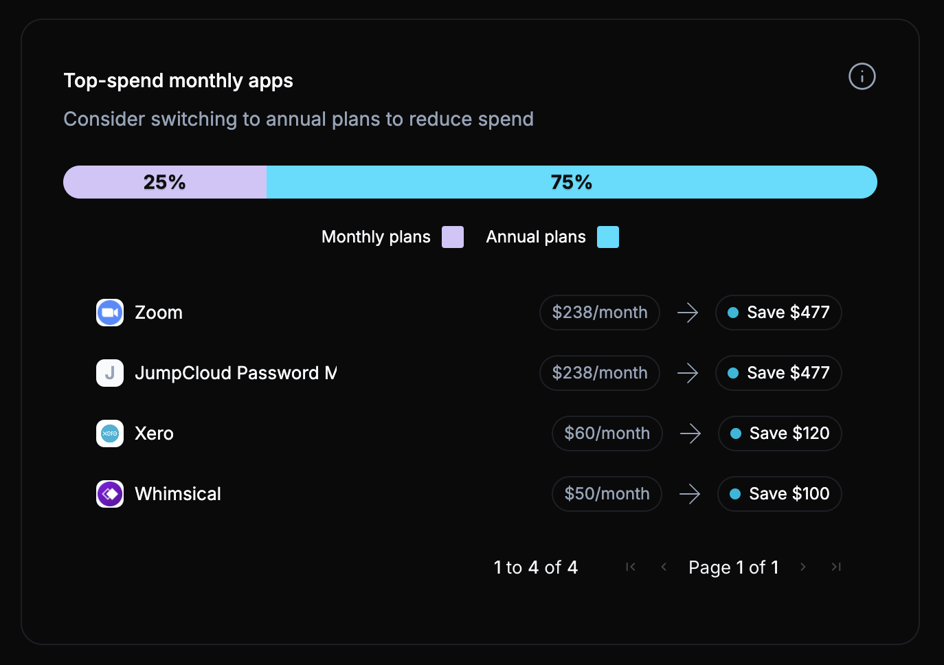 See which of your top monthly spend apps could be converted to annual plans, complete with savings estimates.