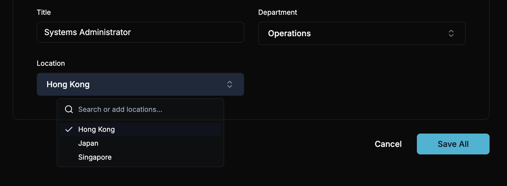 Alongside the department improvements, weâve introduced a location field to user profiles, allowing you to select locations from a dropdown menu for more consistent and reliable group creation. This feature ensures uniformity in location names across dynamic group rules, making it easier to create and manage groups based on geographical locations. You can even add new locations directly from the field, simplifying user management further.