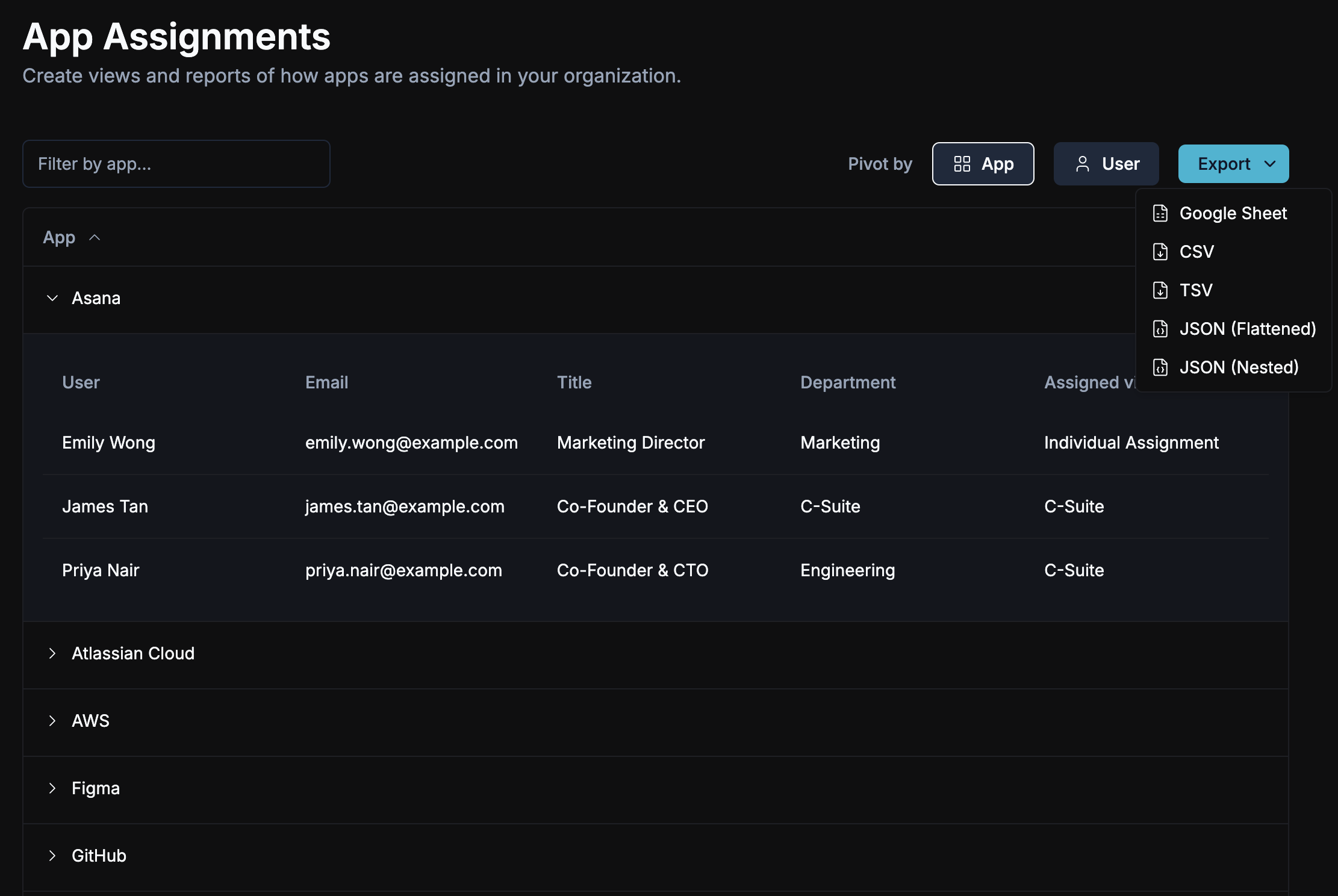 To make your workflow even more efficient, weâve added multiple export options, including CSV, TSV, JSON (both flattened and nested), and Google Sheets. The Google Sheets export comes with built-in pivots, giving you the flexibility to analyze and visualize your data exactly how you want. With this update, managing who has access to what apps has never been easier!