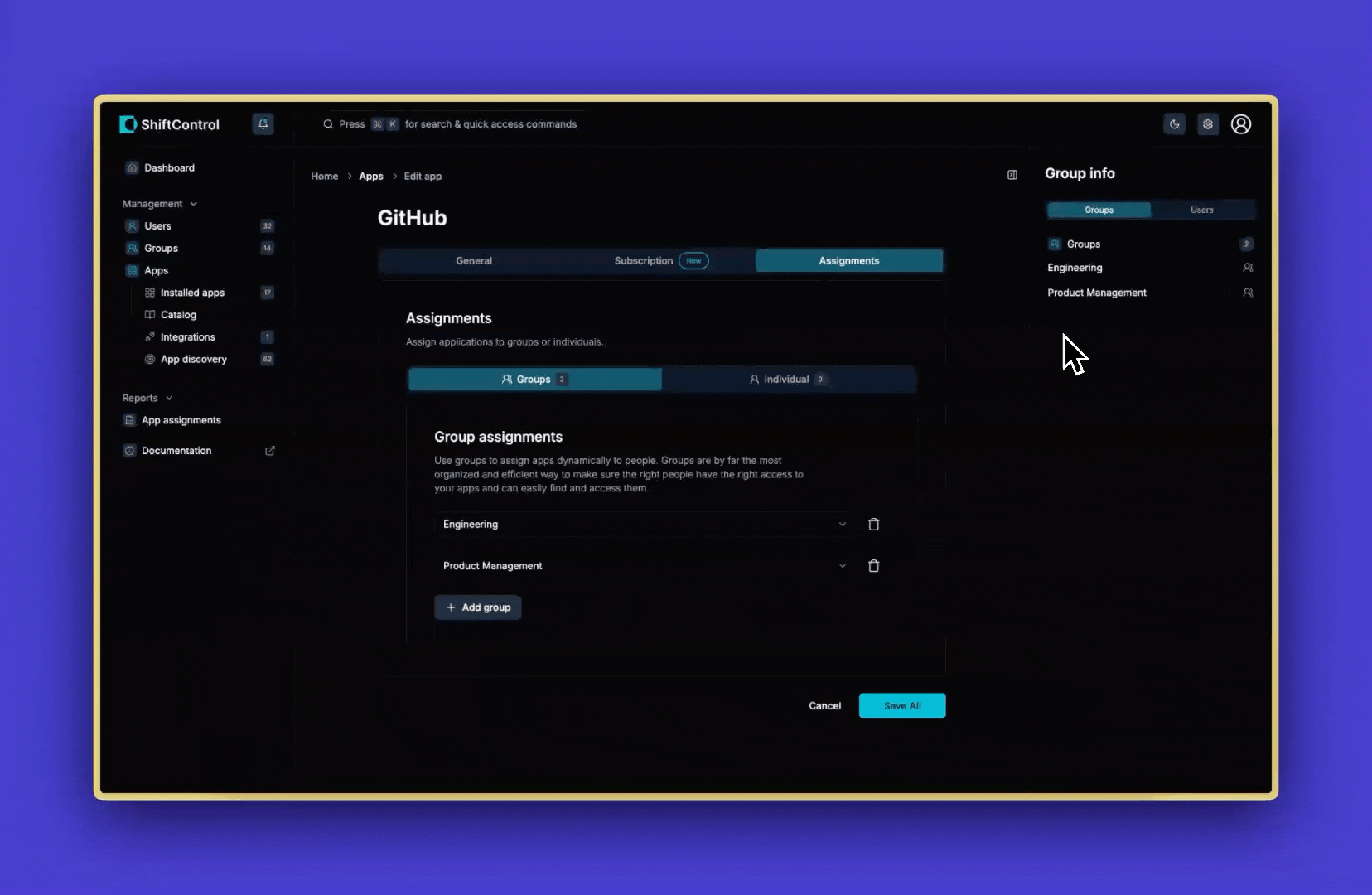 Weâve simplified the process for managing group access to JumpCloud Password Manager. Previously, managing group assignments for the password manager required direct actions in JumpCloud. Now, itâs treated like any other app within ShiftControl, allowing you to manage group access directly from our platform without needing to switch back and forth.